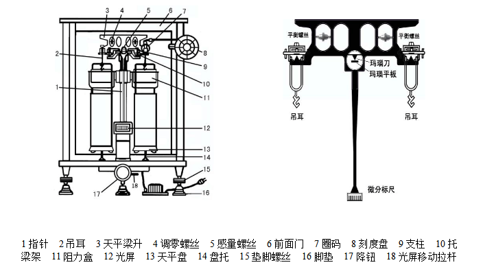 (2) 指針:固定在天平梁的中央,指針隨天平梁擺動(dòng)而擺動(dòng),從光幕上可讀出指針的位置。 (3) 升降鈕:是控制天平工作狀態(tài)和休止?fàn)顟B(tài)的旋鈕,位于天平正前方下部。
