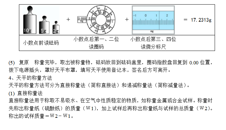 此法用于稱取粉末狀或容易吸水、氧化、與二氧化碳反應(yīng)的物質(zhì)。減量法稱量應(yīng)使用稱量瓶,稱量瓶使用前須清洗干凈,干凈的稱量瓶(蓋)都不能用手直接拿取,而要用干凈的紙條套在稱量瓶上夾取。稱量時(shí),先將試樣裝入稱量瓶中,在臺(tái)秤上粗稱之后,放入天平中稱出稱量瓶與試樣的總質(zhì)量(W1),用紙條夾住取出稱量瓶后,按圖示方法小心傾出部分試樣后再稱出稱量瓶和余下的試樣的總質(zhì)量(W2),稱出的試樣質(zhì)量=W1-W2。 減量法稱量時(shí),應(yīng)注意不要讓試樣撒落到容器外,當(dāng)試樣量接近要求時(shí),將稱量瓶緩慢豎起,用瓶蓋輕敲瓶口,使粘在瓶口的試樣落入稱量瓶或容器中。蓋好瓶蓋,再次稱量,直到傾出的試樣量符合要求為止。初學(xué)者常常掌握不好量的多少,傾出超出要求的試樣量,為此,可少量多次,逐漸掌握和建立起量的概念。注意:在每次旋動(dòng)指數(shù)盤和取放稱量瓶時(shí),一定要先關(guān)好旋鈕,使天平橫梁托起。 5、天平的使用規(guī)則